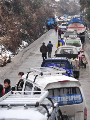 > 巴东:冰雪天气致209国道上大货车挡住300台车