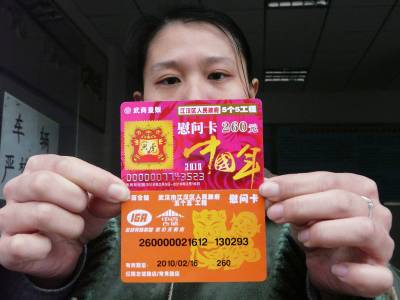 武汉市江汉区13条街道116个社的低保对象中筛选的15600户生活特困的家庭的"五个五"5斤鱼、5斤肉、5斤鸡蛋、5斤食用油、50斤大米,己由该区人民政府特制了虎年慰问卡,总价值达400多万元。生活特困的家庭可持卡到就近的武商量贩、中百仓储、中百超市,购买"五个五"。此卡即将发放到各街社区生活特困家庭之中。2月2日,该区民政局工作人员,展示虎年"五个五"慰问卡。