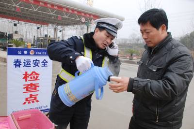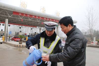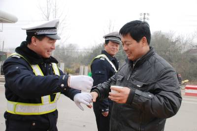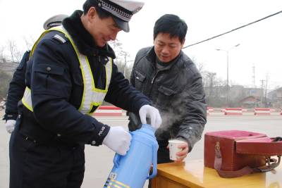 3日,黄冈市交通民警在黄州陶店收费站为过往司机服务倒开水。自春运启动后,黄冈市交警支队投入警力、人力,在车站候车厅,各收费站设立春运便民服务点,为司乘人员提供地图、晕车药物,发放交通安全宣传资料,提供一切便利条件,全心全意服务2010年春运工作。