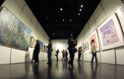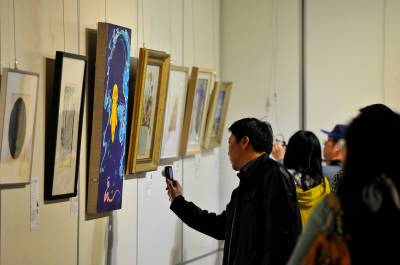 昨日(13日)上午,“艺术汇楚天,湖北慧更好”第二届九城艺术联展(武汉站)在武昌辛亥革命博物馆开幕,来自全国十座城市的300余幅涵盖国画、油画、版画、书法等艺术精品亮相,吸引众多热爱艺术的市民前来欣赏,不少收藏爱好者现场买走喜爱的字画。(记者 李溪 摄)