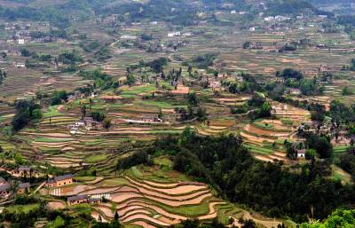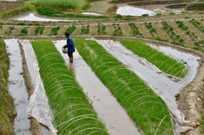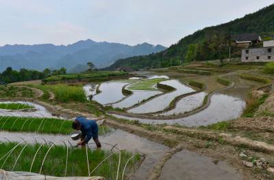 2013年4月13日,巴东县东瀼口镇牛洞坪村七组农民忙着给秧苗施肥。牛洞坪村有2500亩水稻,现秧苗普遍长势良好,再过半个月时间就可以大面积移栽。