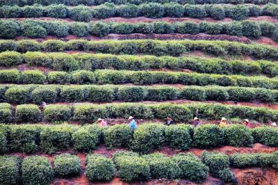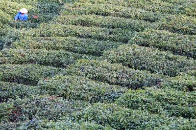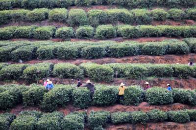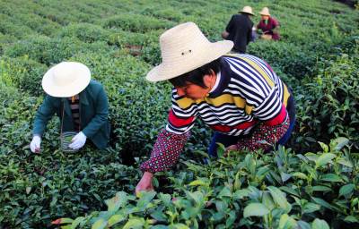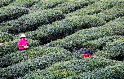 4月13日,湖北省十堰市郧县谭家湾镇五道岭村的茶农在茶园采摘春茶。湖北省十堰市郧县为南水北调中线核心水源区,为保障清水北送,近年来围绕富足的山水资源作文章,大力发展茶叶、木瓜、胡桑、核桃等绿色生态富民产业。目前,该县发展茶园面积3.65万亩,年产干茶700吨,产值8000万元。茶叶已经成为库区农民脱贫致富的一大支柱产业。