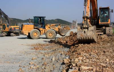 公路建设战犹酣 4月14日,大型机械在公路建设工地施工。截至当日,竹溪县“北环路”一标段全线贯通。(视界网 王忠春 摄)