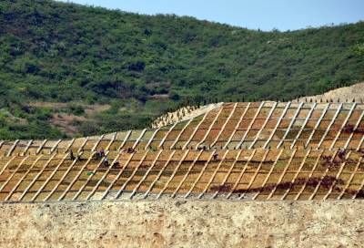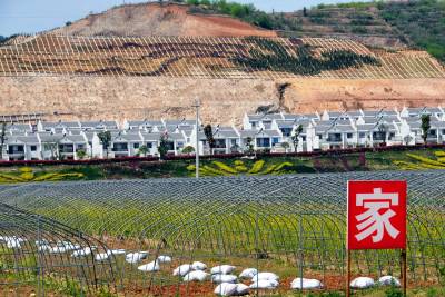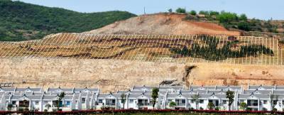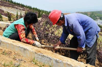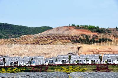 4月15日,郧县园林员工正在汉江南岸的柳陂镇移民新村卧龙岗社区后的高切坡上的方格内栽植凤凰造型的绿篱图案。与北侧用龙柏栽成的青龙形成龙凤呈祥的巨幅观景图。