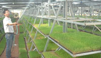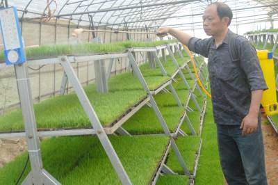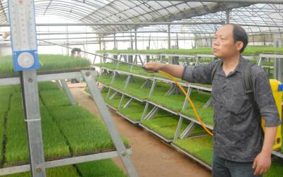 4月15日,位于湖北省武穴市魏高邑科技园大棚育秧示范大棚温度高达38℃,为了防止早稻大棚育秧“烧苗”,该市农业局技术人员全天候不间断地为秧苗浇水降温,并喷施“铜高尚”、“可杀得”防苗期棉腐病、立枯病!为了有效解决农户分散育秧缺劳力、缺技术,武穴市今年投入150万元,对两个大型育秧基地进行升级改造,并建立40个中、小型育秧基地,在全市7个镇、79个村集中育秧204万盘、26.81万平方米,可供7.7万亩油菜茬后三田栽插。此举有利于恢复和扩大双季稻生产,使全市全年早稻种植面积32万亩,同比扩大1.2万亩,增3.9%。本报视界网冯怡红 通讯员陈容见摄影报道