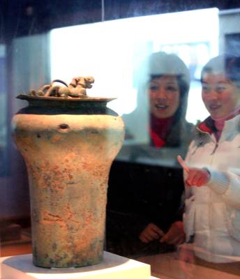 2月5日,游客在湖北省恩施土家族苗族自治州博物馆参观双虎钮錞于。双虎钮錞于属东汉时期的一种军乐器,土家人以白虎为图腾崇拜,所以其上以虎形装饰。今年又是农历虎年,这樽双虎钮錞于吸引了不游客前来参观。