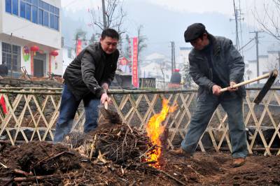 2月5日,湖北省宜昌市夷陵区乐天溪镇兆吉坪村的村民在田地深耕、烧火粪。眼下立春刚过,虽然临近春节,但宜昌乡村人勤春来早,农民们及早做好春耕生产,迎接又一个丰收年的到来。