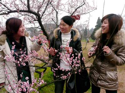 2010年中国武汉东湖梅花节,2月6日,在东湖梅园开幕,虽梅花受天气影响没有全部盛开的美景,但仍吸引了数千游客前来赏梅。在这游客当中,有3位与"梅"有关在汉进城打工的靓丽女孩,陈冬梅(中)梅丽娟(左)梅丽莉(右)荣幸免费入园后,尽情赏梅花笑开颜。