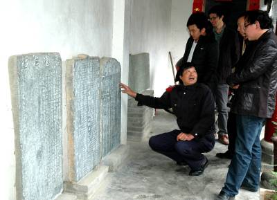 1、胡学俭(蹲者)在向参观者介绍收藏的碑碣。