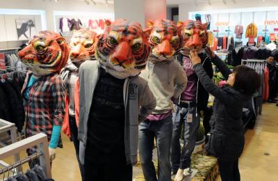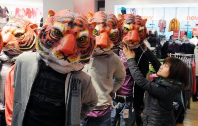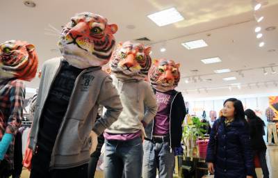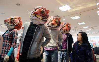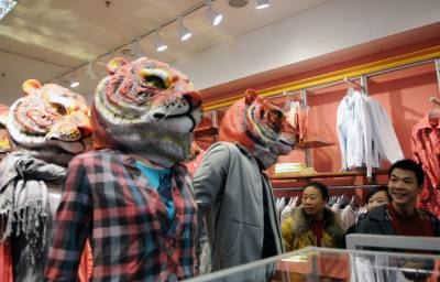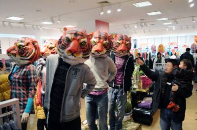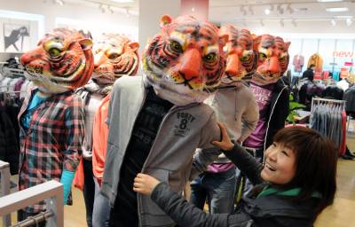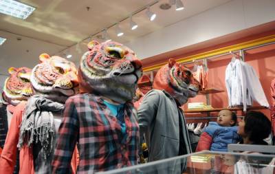 2月7日,襄樊市长虹路武商百货二楼ESPRIT服装专柜的虎头模特,吸引不少市民驻足观看。虎年临近,该专柜工作人员为七个模特戴上虎头模型,正是为了营造节日氛围,吸引顾客。谢勇摄