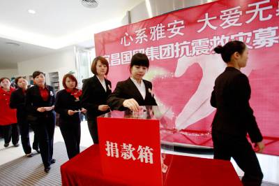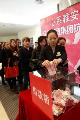 心系雅安 大爱无疆 4月23日,职工自发参加募捐活动。当日,“心系雅安、大爱无疆”宜昌国贸集团抗震救灾募捐仪式在国贸大厦举行。活动得到了国贸员工的踊跃支持。据了解,国贸集团已为雅安地震灾区捐款40万元。 本报视界网 黄翔 摄