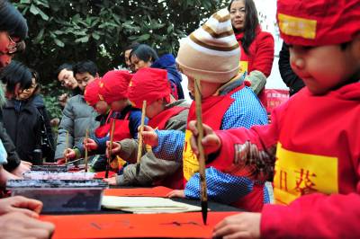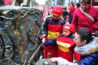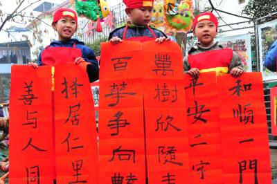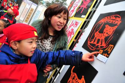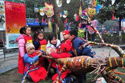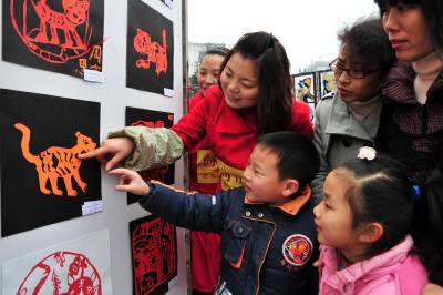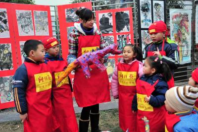 2月7日,湖北省宜昌市向日葵艺术教育基地少儿才艺展示走进夷陵区,共展出小朋友们利用树枝、废报纸、铁丝、泡沫、毛线、矿泉水瓶、瓶盖和纽扣等物品制作的”虎年香囊”、”恐龙”、”恐龙蛋”、”青铜器”、”图腾柱”以及少儿剪纸、书法、绘画等作品200多件,吸引了众多市民驻足观看,现场还有数名少儿书法爱好者泼墨挥毫书写春联,把新春的祝福送给大家。