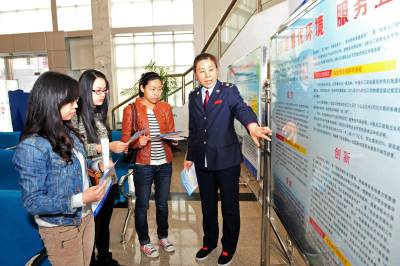 本报讯 全国第22个税收宣传月期间,江夏区国税局依托办税服务厅,深入开展阵地宣传,他们采取多种形式编印宣传册;制作宣传展版,让纳税人了解最新税收政策。图为税务人员为纳税人讲解省国税局出台的服务“五个湖北”建设50条意见。( 邬继军 )