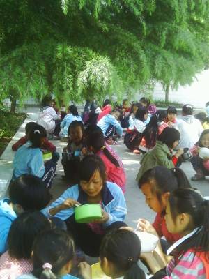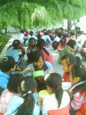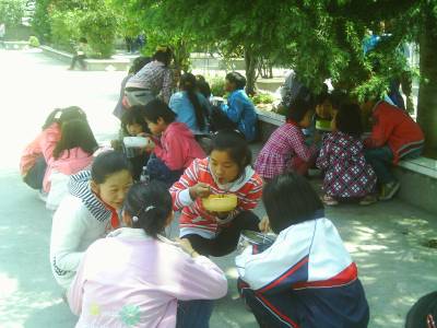 4月27日中午,巴东县官渡口小学的学生打好饭,来到校园的大树下、花带边,三个一伙、五个一群围在一起津津有味地吃着午餐,别有一番风味。 近日,该校对学生食堂的食谱进行了改进,凉菜、炒菜、汤菜进行合理搭配,学生吃得香、吃得可口。