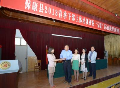 4月27日,保康县委党校春季干部主体班几位学员代表将全体学员的爱心捐款交给县慈善总会相关负责人。 “一方有难,八方支援”。四川雅安芦山县地震灾情时刻牵动着保康县委党校2013年春季干部主体班全体学员的心。当日,全体学员自发组织为四川雅安芦山县地震灾区人民捐款献爱心,共捐赠现金4200元。 据悉,这是保康县收到的向四川雅安灾区的首笔爱心捐款。县慈善总会相关负责人表示,将通过有关部门迅速将这笔爱心捐款送到灾区。 (本报视界网 陈泉霖 摄)