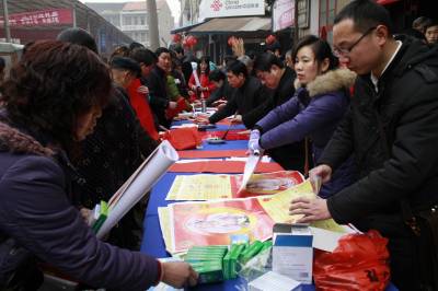 春节前夕,应城市郎君镇组织计生办工作人员和书法爱好者,上街为育龄群众免费义务书写春联,发放计生年画和避孕药具,深受广大育龄群众喜爱。(图为书法爱好者在为育龄群众书写计生对联。)(通讯员丁艳红)