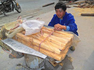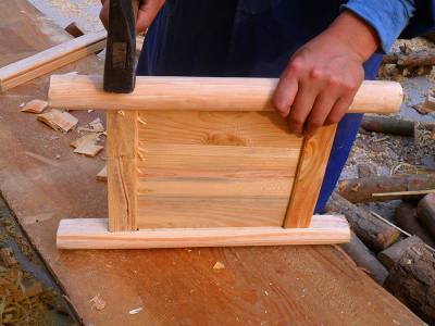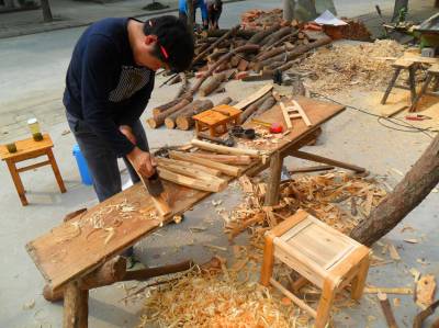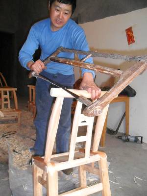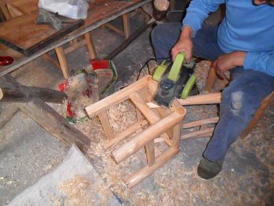 自古以来, 椅子是家庭必备的生活用具,迂椅子的师傅称为椅匠。椅匠使用的原料为小松树及竹子;主要工具有墨斗、锉、刀、锯、卡圆铇、锤、斧等;工艺流程是上山选树、下料粗加工、蒸椅腿、组装定型、抛光。加工椅子腿的转弯处(俗称克七弯弯)有火烤、水蒸两种方法,其中水蒸一般4个小时,要把木腿弯弯蒸软试迂时不起欠(即不起层壳)才行。一把工艺上乘的木椅要神墨紧,平整光滑,无翘角。1982年以前,宜昌县分乡公社每个管理区有椅匠2至3人。2000年以后,青年人不愿意学这门手艺。2013年,宜昌市夷陵区分乡镇内活跃的椅匠是天鹅池村41岁的谭少龙,他16岁学艺,19岁出师;一天迂4把木椅子,加工费每把35元。沒上光油的木椅子市场销售价每把70元。(本报视界网 袁国悦摄)