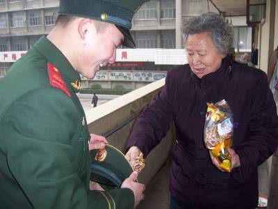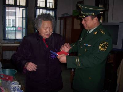 ”兵儿子”给”妈妈”拜年——武警某部官兵慰问孤寡老人纪实2月9日,武警湖北总队一支队三中队中队长李国强带领几名战士来到驻地长丰乡长丰村孤寡老人龚妈妈的住处,给”妈妈”带来了中队全体官兵真切的问候,还有丰厚的慰问品、慰问金,并为”妈妈”清理房间卫生,修理了不能正常通气的煤气管道等,老人激动得热泪盈眶,动情地说:”有你们子弟兵的牵挂,我不再孤苦!”(初寒乍暖,最难将息。2月9日,距中国的传统佳节还有四天。从军在外的游子对家、对妈妈的思念越来越深;而此时的武警湖北总队一支队三中队全体官兵不仅在思念自己的妈妈,有一位孤寡老人龚妈妈更让他们牵肠挂肚。带着这份深深的牵挂,一支队三中队在大队党委的殷切嘱托下,中队长李国强带领几名战士一行,来到长丰乡长丰村孤寡老人龚妈妈的住处,给”妈妈”带来了三中队全体官兵真切的问候,还有丰厚的慰问品、慰问金。当”儿子们”出现在”妈妈”的眼前时,她望眼欲穿的泪水夺眶而出,继而又是喜出望外的笑容满面。中队长李国强紧紧握住龚妈妈的手,嘘寒问暖;龚妈妈激动的说:”有你们子弟兵的牵挂,我不再孤苦!”放下慰问品,李队长亲自卷起袖子带着一起来的几名战士为”妈妈”清理房间卫生,还为”妈妈”修理了不能正常通气的煤气管道。当房间里变得更加明亮整洁时,已经是12点过了;”妈妈”乐呵着要为他们亲手下厨做几个菜留他们吃午饭,但是队长李国强以:”我们是人民子弟兵,都是您的儿子;我们只有对您尽孝的义务,没有对您吃、要、拿的权利。”而婉言谢绝。临别时,”妈妈”依依不舍。从柜子里拿出一袋糖果,追出门外硬要塞给他们。热泪盈眶的说道:”你们吃我一颗糖果,我的心里更暖和更踏实。”要上车了,”妈妈”再一次握住李队长的手,谢语连连、不肯松开。车子驶出院门时她依然没有回去,久久的凝望,不仅是不舍的目送,更是一份深切感情的牵连!)叶刚杨德华15971434320