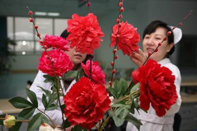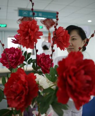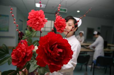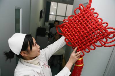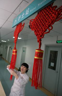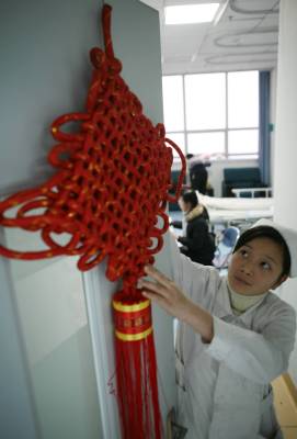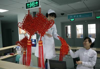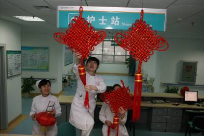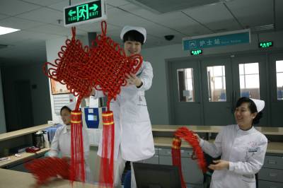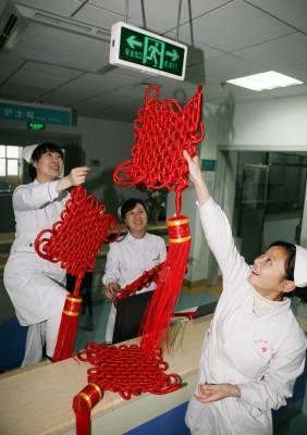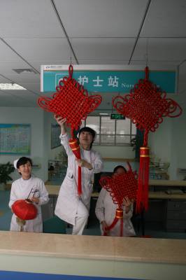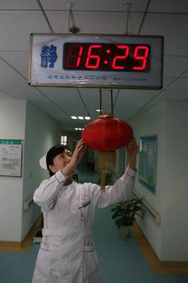 虎年春节,湖北省襄樊市第一人民医院处处张灯结彩,在病区里挂上灯笼、中国结等春节饰品,将医院布置得喜气洋洋,显得年味十足,既喜庆又热闹,给病人一种”家”的感觉,让不能出院而”留守”的患者热闹过大年。