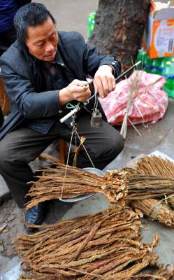 视界网签约摄影师宋文2月11日,一位老农早早地来到宣恩县城,铺开摊子开始将他自家种的”草烟”(俗称叶子烟)分级、扎把、过枰,以方便人们购买。尽管琳琅满目的年货堆满了街,但本地产”土货”市场仍然活跃。这不,农民自家喂的鸡还没等走进交易市场便已被争相购买,而土家人过年喜欢的糍粑也卖得不错。腊市上,”土货”已成为紧俏商品,这种早早地就销售一空的场面,自然会让农民心里乐开了花。如今早已告别了物资匮乏的年代,人们的消费也更加理性,更加愿意从”健康”的角度去选择食品。而在人们心中,”土货”是绿色、无污染的。把时间向后倒推十几二十年以观察人们的消费轨迹不难发现:人们从崇尚”洋货”到追捧”土货”的回归,所折射的人们生活质量和生活水平的变化,所反映的是改革开放带给人民群众的幸福生活。作者单位:宣恩县新闻中心联系电话:13986850929