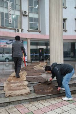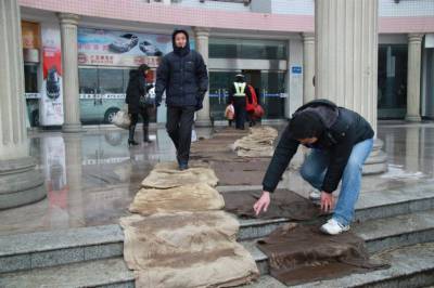 2月11日,汉川汽车客运中心站工作人员正在整理进站通道。为做好雨雪期间客运服务,汉川汽车客运中心站安排专人,对进站道口铺设防滑麻袋,撒融雪剂,并实行保姆式亲情服务。