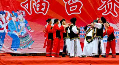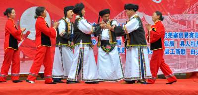 4月30日下午,湖北天韵羌寨的舞台上,一支民间表演队正在跳着、唱着;一杯酒啊 擂堆 擂呀擂堆打 打呀打擂堆 喝一杯呀 再来划。据了解,“打擂堆”是麻柳溪最早、最古老的敬酒歌,已经有一百多年的历史。如今湖北咸丰黄金洞乡麻柳溪成为旅游四A级景区的其中的景点之一,村民们把这个古老的节目献给来自远方的客人。已经成为游客们的一道“新鲜菜”。图为;4月30日下午,麻柳溪村民正在为游客表演“打擂堆”。