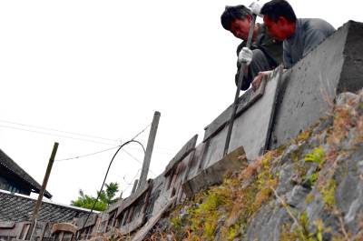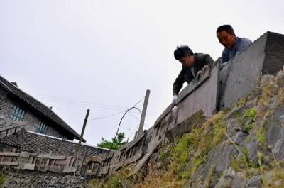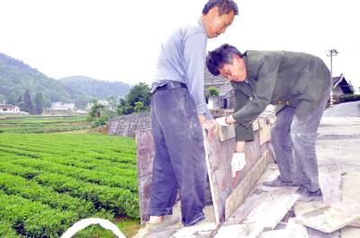 5月3日,建筑工人正在为来凤县大河镇桐子园村的村级公路加固围栏。 为了确保村民安全通行,来凤县大河镇积极争取安保工程项目,对全镇41个行政村的的危险路段进行加宽,修筑围栏。(本报视界网潘家文、潘顺富设)
