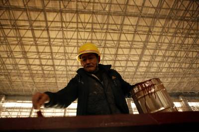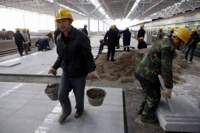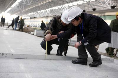 节日中的宜万铁路建设者2010年2月12日,中铁四局建设者在宜昌火车东站3站台铺设花岗岩。中铁四局建设者放弃春节与家人团聚,坚持节日施工。为宜昌火车东站赶在五一节前竣工打基础。据悉,宜万铁路宜昌火车东站是宜万铁路全线七大控制性工程之一,其主站房设计总建筑面积23490平方米,将是宜万铁路东起点最大的旅客集散地,预计日发送旅客6000人次,始发列车50多对。文振效