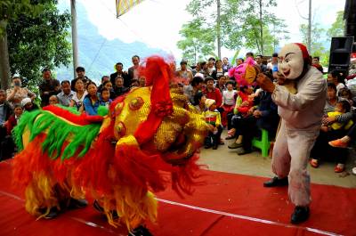 5月4日,在恩施市红土乡稻池村水井湾组,“草根”剧团正在表演舞狮等传统节目。