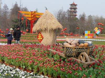 2月12日的武汉市解放公园成了郁金香花的王国,30万盆郁金香五彩缤纷,色彩迷人,是该园为喜庆新春虎年佳节,丰富广大群众佳节期间游园内容而特意举行,将从2月13日(腊月三十)起至2月28日(正月十五)结束,中西合壁的喜庆丰收美景,让先睹为快的群众流连忘返。