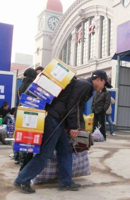 2月12日(腊月廿九)下午,一农民工正步入汉口火车站综合改造后的新大楼去候车。标志着该站的部分设施己正式投入了2010年春运。