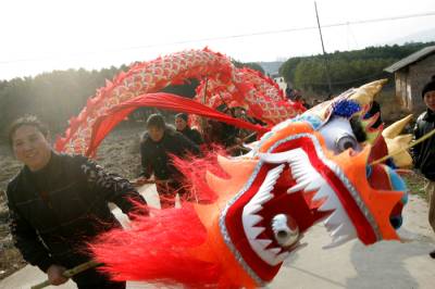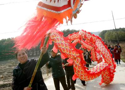 湖北通山县大夫第村有个35名女子组成的龙灯队,全是该村女同胞,年长近60岁,最小16岁,2月12日,她们正在村头操练,准备大年三十吃完年饭后,向各村镇进行玩龙灯拜年。