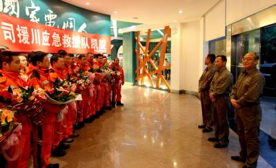 5月6日,宜昌供电公司援川应急救援队圆满完成了全部抢修任务,回到宜昌,受到职工的热烈欢迎,从4月27日入川以来,救援队克服震后地形条件恶劣、余震不断、人手不足、持续阴雨天气等困难,29名队员勇于奉献、不畏艰险、连续作战,排查输电线路16.5公里,人工组立电杆一基,扶正倾斜电杆三基,组立变压器台架一副,新装100千伏安变压器1台、变压器试验4台,人工铺设高低压电缆600米,圆满完成了全部抢修任务,受到芦山县双石镇人民的衷心感谢,得到上级部门和领导的高度赞誉,彰显了负责任的企业形象,为国家电网品牌增辉。