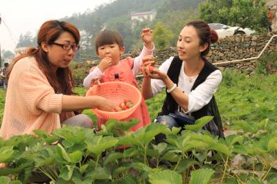 5月5日,市民在郧县经济开发区樱桃沟村采摘草莓。时下,正值樱桃、草莓上市。众多市民利用星期天休息时间前往樱桃沟村采摘樱桃、草莓,休闲娱乐。一家人下地上树采摘草莓和樱桃,一边品尝一边拍照,中午在农家乐品尝绿色食品,真是其乐融融。记者齐海燕摄