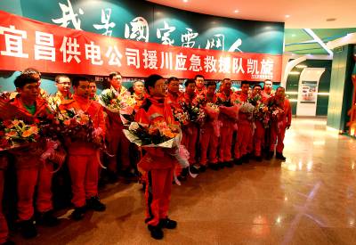 5月6日,宜昌供电公司援川应急救援队圆满完成了全部抢修任务,回到宜昌,受到职工的热烈欢迎,从4月27日入川以来,救援队克服震后地形条件恶劣、余震不断、人手不足、持续阴雨天气等困难,29名队员勇于奉献、不畏艰险、连续作战,排查输电线路16.5公里,人工组立电杆一基,扶正倾斜电杆三基,组立变压器台架一副,新装100千伏安变压器1台、变压器试验4台,人工铺设高低压电缆600米,圆满完成了全部抢修任务,受到芦山县双石镇人民的衷心感谢,得到上级部门和领导的高度赞誉,彰显了负责任的企业形象,为国家电网品牌增辉。