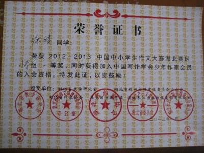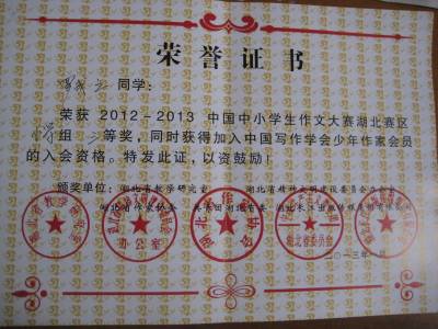 5月7日,从宜城市刘猴小学传来好消息:该校三名学生在2012—2013中国中小学生作文大赛湖北赛区小学组竞赛中获奖,其中,五(2)班的李德志和六(2)班的徐晴荣获一等奖,六(1)班的罗成之荣获三等奖,本次作文竞赛由湖北省精神文明委员会、共青团湖北省委、湖北省作家协会、湖北省教研室、长江出版社联合举办。(本报视界网 周卫华 摄)
