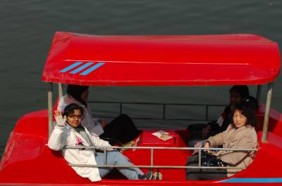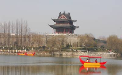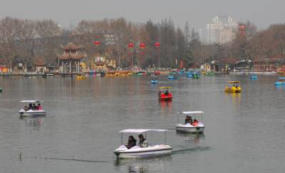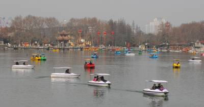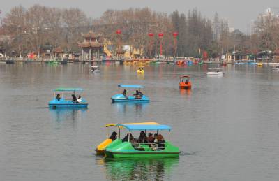 1月18日,湖北襄樊迎来明媚的阳光,市民在护城河上荡舟踏春,当日,襄樊最高气温回升到11℃,市民们走上街头,享受节日的快乐,感受春天的气息。
