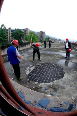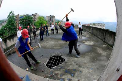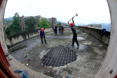 5月10日,工人在巴东县信陵镇黄土坡社区拆除原县残疾人联合会办公楼。