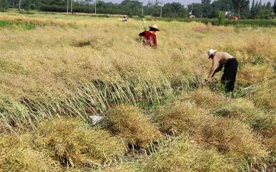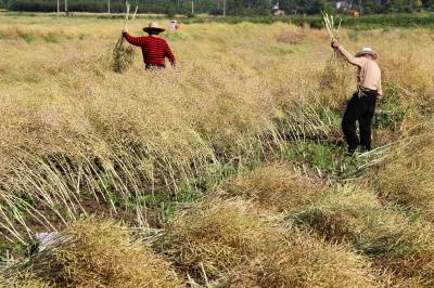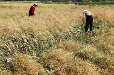 5月11日,双峰山良种油菜繁育基地上,农民在收割油菜。双峰山1200亩良种油菜目前进入成熟期,度假区组织群众抢天时抓紧收割。特约记者杨金华摄