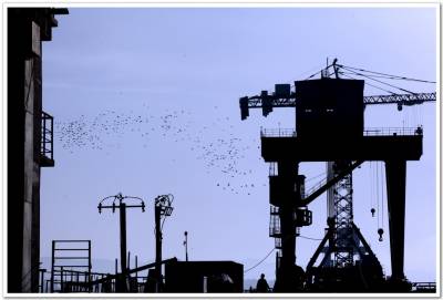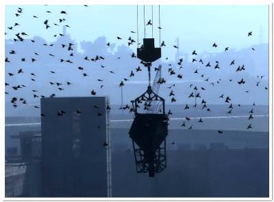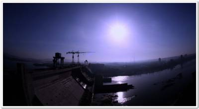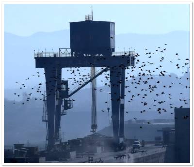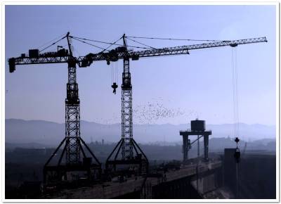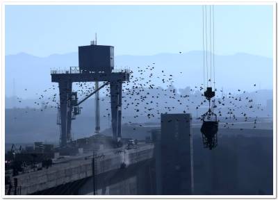 5月11日,清晨,当太阳初升,晨光映照下的的丹江口大坝,高耸云天的施工起吊机, 成百上千的飞鸟,波光粼粼的流水, 光影变幻、浑然天成、犹如一幅展开的蔚为壮观画卷。