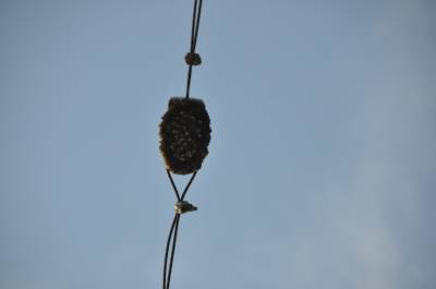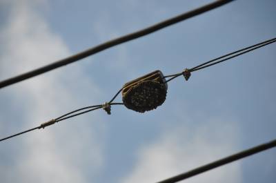 天上蜂巢 11日,湖北省鹤峰县中营乡白鹿村公路上,电线横架南北,就在高空公路上空,野峰在电线上筑起蜂窝,成为天上蜂巢。这是鹤峰县多年以来结对森林和野生动物保护的结果,绿水青山,美丽家园,好多曾经看不到的野生动物向公路和农户家园边转移。