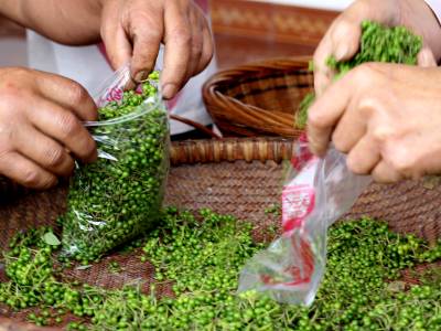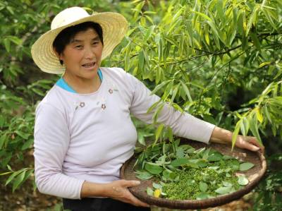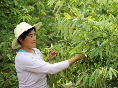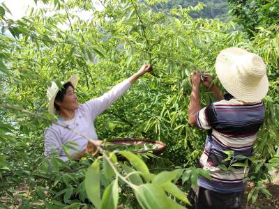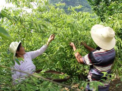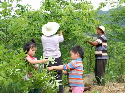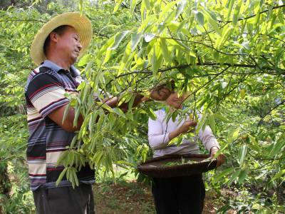 今年60岁的刘玉堂,5年前移民到巴东县金果坪乡金坪村。在垦荒过程中,刘玉堂发现有许多野生的山胡椒树。于是,他将这些山胡椒树保留下来,还在自己的房前屋后移栽了400多株胡椒树,目前大部分胡椒树进入丰产期。这些山胡椒在市场上很受欢迎,每斤售价10—15元,仅此一项刘玉堂一年收入可超过三万元。图为刘玉堂和老伴在胡椒园里采摘山胡椒。