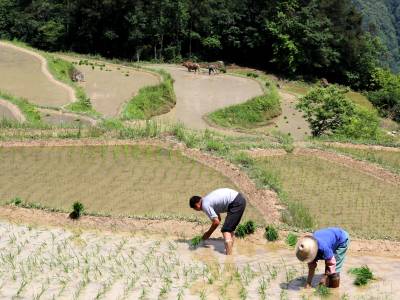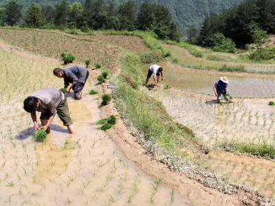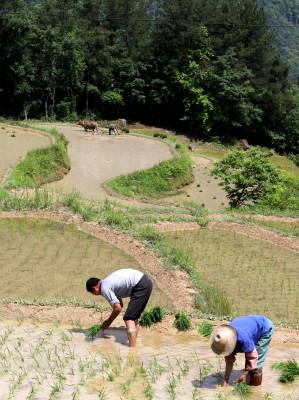5月13日,在巴东县金果坪乡下村湾村层层梯田上,农民们正抢抓雨后晴好天气忙着犁田、栽秧。几场大雨过后,干涸的稻田都蓄满了水,各地群众自发组成互助组抢插秧苗。目前,该县农村稻田90%已犁耙完毕,60%已栽好秧苗。