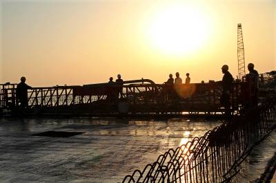 5月13日清晨6:56分,随着最后一斗混凝土顺利浇筑进模板,工人们立即跟进振捣、抹平、收浆——国家重点工程黄冈长江大桥最后一跨公路梁——南岸公路引桥S10-11#墩上游侧现浇梁浇筑完毕。没有鲜花、没有仪式,在平静的气氛中,黄冈长江大桥全部主体工程顺利完成。这座寄托着革命老区黄冈770万人民多年夙愿和期盼的世界级桥梁取得了最后决战的决定性胜利。