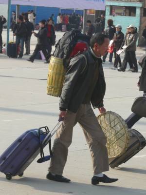 2月19日(正月初六)下午,在汉口火车站广场上一位农民工身背装有红色箱包的背篓,一手提着家乡的米筛,一手拖着旅行小板凳行李箱,向该站临客财神广场候车室走去。从一个侧面反映了农民工外出打工,离乡离土不离本行,与时俱进的时代变化。