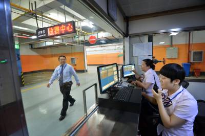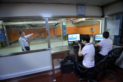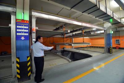 14日,武汉首座湖底立体停车场一景。 工作人员演示湖底立体停车场车位升降设备。