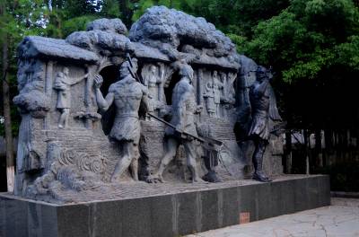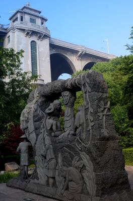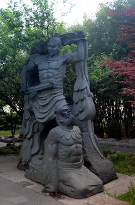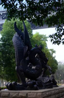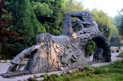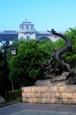 大禹神话园是武汉市汉阳江滩的一部分,位于汉阳晴川阁与武汉长江大桥之间的长江江滩之上,是以大禹神话雕雕塑为主题的景观园。大禹神话园长约400米,宽约60米,分上、中、下三区和中国洪水文化展示馆共四个部分:上区:从长江大桥汉阳桥头北侧,至大禹祭祀台(现江堤箱式防水墙)南侧,由玉面人像、双龙门、“应龙画河海”青铜雕和禹父鲧治水透雕组成。中区:以大禹祭祀台及相连的圆形九鼎广场为中心,由“剖鲧禹生”、“搏杀相柳”、禹阅九鼎铜雕和“三过家门不入”圆雕,以及大禹北方治水神话传说系列高浮雕组成。这些雕塑堪称珍品,其中,“大禹北方治水”是目前国内最大的高浮雕。下区:从大禹祭祀台北侧至晴川阁景区外墙江滩边,以大禹南方治水神话等散点链式石雕、印章蓝田石刻,以及6米高的镇江柱等组成。