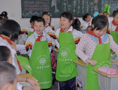 5月20日,孩子们正在试穿准备送给妈妈的“环保围裙”。当天,由巴东县环保局、教育局联合开展的“环保知识进课堂”走进野三关民族小学,向孩子们宣传环保知识。据了解,五月以来,宣讲团深入全县12个乡镇,将环保知识送进学校、送进农家,发放宣传资料10000余份,环保围裙千余件,以增强学生和广大居民的环保意识,倡导全民环保。(本报视界网 杜永华/摄)