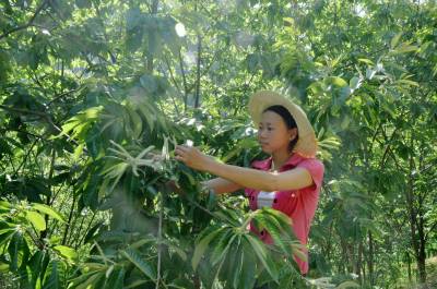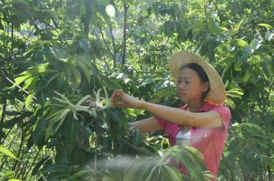 5月21日,金果坪乡枫香淌村四组栗农彭绪翠正在板栗园里摘心和疏雄。近年来,该乡运用国家退耕还林政策,在清江沿岸发展了以板栗为主体的万亩干鲜果带,为促使栗农增产增收,目前该乡农业和林业部门主打科技牌,组织栗农进行摘心疏雄新技术运用。据悉,板栗摘心疏雄技术,是近年来随着板栗密植栽培的兴起而研究推广的一门新技术,是密植板栗园获得早果早丰、高产稳产优质;促进树体提早成形、减缓结果部位外移速度和板栗园郁闭速度的非常有效的技术措施,通过实施摘心和疏雄新技术可提高产量35%-40%。