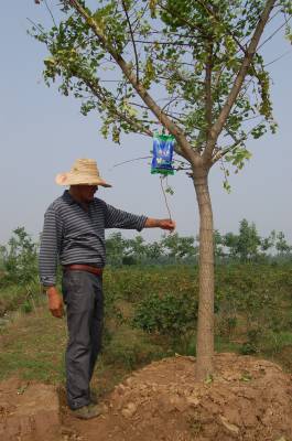 21日,云梦县道桥镇洋湖村绿康馨苗木花卉生态农庄工作人员在为银杏树“打点滴”。连日来,绿康馨苗木花卉生态农庄苗圃园中,一棵棵新栽植的银杏树在人头高的树身处悬吊着一袋袋“快活林”液体,一条条细小的导管连着“针头”直插树皮下,果树也像人类一样打点滴。袋子里的液体随着细细的导管慢慢“流”进果树体内,为新栽植的果树及时补充水分营养,促进成活生根生长。视界网 陈保忠 何贵平 摄